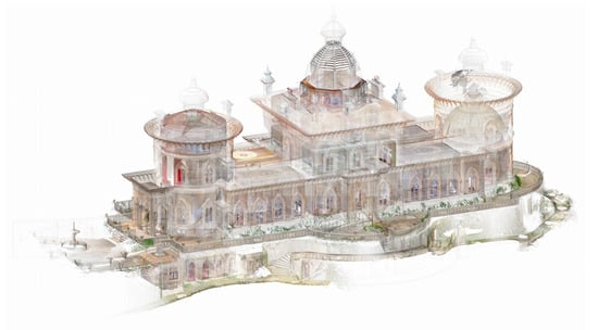 Concerns relative to an accurate geometric representation led to the acquisition of geometric and physical data relating to the construction system and ambient vibrations. Among them, a topographic survey made it possible to obtain the real coordinates of the palace and a survey using TLS technology, which, after data processing, allowed us to obtain the representative point cloud of the palace that later served as the basis for the H-BIM modeling in Autodesk Revit software. GPR surveys were also conducted to characterize the structure better, as semi-destructive or destructive techniques could not be used due to the historical value of the site.