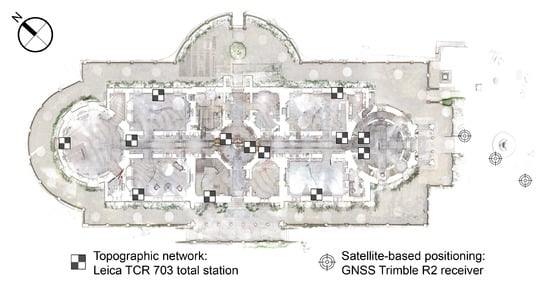 Regarding the geometric data acquisition, 336 scans were carried out with TLS to obtain geometric information about the Monserrate Palace. Of this total, 205 scans corresponded to the rooms of the central body and side wings, which were the object of the study. These scans were acquired with a Faro Focus S70 laser scanner starting in April 2021. For each scan, a combination of parameters was selected, considering the amount of information that was needed from each room of the palace and finding a balance between collected information and the duration of its acquisition. The detailed point cloud was processed in Autodesk ReCap® [], and was the basis of the geometric model (Figure 3). To geo-reference the model, a topographic survey was carried out with a GNSS receiver and total station with the support of topographical targets located at strategic points (Figure 4). The coordinates (M, P) are relative to the PTTM06/ETRS89 system, and the H coordinate, orthometric altitude, is in relation to the Cascais tide gauge.