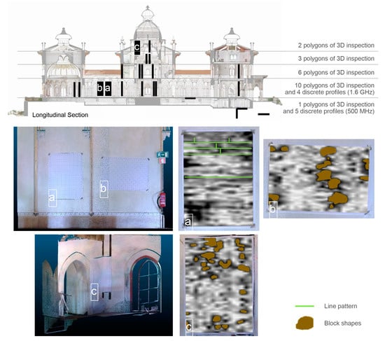 Due to the scope of the work, a clearer comprehension of structural composition was required whilst maintaining the physical elements of the palace; as such, non-destructive tests were applied. Therefore, in areas where the construction technique applied was unknown, ground-penetrating radar (GPR) surveys were conducted by a team from Morph Geociências Lda [] and coordinated by the IST team. Through the emission and reception of electro-magnetic waves in the object, it was possible to decipher cavities and alterations in materials, which allowed for a better understanding of the constitution of the elements. In total, we obtained 22 polygons of a 3D inspection with a 1.6 GHz geo-radar, 4 discrete profiles with a 1.6 GHz geo-radar in the columns, 2 discreet profiles with a 500 MHz geo-radar on the pavement and 3 discreet profiles with a 500 MHz geo-radar in the wall. Of which, for the central body, there are 14 polygons of 3D inspection and 2 discrete profiles in the columns. The survey helped to identify the construction apparatus in several walls that were previously mis-categorized, such as the walls on the higher floor in the central tower, which turned out to be composed of masonry instead of brick (Figure 5c) as originally expected, as well as the opposite seen in the ground floor corridor niche (Figure 5a,b). For the remaining elements, the construction technique was inferred from the surveys or exposed elements, such as the walls viewed from the foundation level.