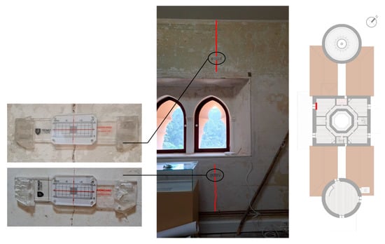 Due to the good conservation of the Monserrate Palace, no cracking state was generally acknowledged. Only one major crack was identified indoors in the west workroom over the window on the third floor of the central body of the palace (Figure 6). As no other cracks or inclinations in the walls were surveyed, it was decided to only place crack meters along this crack to periodically monitor and control any movement that occurred instead of displacement transducers.