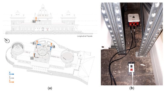 For the ambient vibration tests, using the unique dynamic monitoring, two types of accelerometers were placed in situ with different typologies and basic characteristics (Table 1 and Figure 7b). The first was a piece of force balance vibration measuring equipment (EpiSensor ES-T triaxial measuring and digital recording unit) from Kinemetrics Inc. (Pasadena, CA, USA) The Etna2 was capable of recording a series of accelerations observed in three orthogonal directions (two horizontal and one vertical). Their communication was performed using a laptop computer connected with a GPS/GNSS antenna (global position system/global navigation satellite system). The units were configured with the highest available sensitivity of ±1 g at full-scale with a 24-bit resolution (accelerations ranging from 5.96 × 10−8 g to 1 g) for a frequency of 200 Hz, and each assay lasted for a duration of 660 s.
