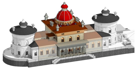 The building information modeling (BIM) approach uses a centralized database that allows access to information in accordance with a users’ profile. This brings benefits at each stage of this type of work, namely, due to its adaptability to project modifications or the easiness in communicating between all specialties involved in the design and construction process, reducing the costs and time of planning and construction and, consequently, making the process more efficient. One of the emerging fields of BIM application is in monuments and buildings with heritage value, usually referred to as an H-BIM. According to Biagini et al. [], the major difference between a BIM model and an H-BIM model is the need to consider not only the information regarding the objects and their properties, but also their history and cultural identity. Additionally, the level of complexity of the representation of elements in an H-BIM needs to consider not only its function, but also future analyses intended for the element; as such, it is important to determine the geometric detail during the modeling and to establish the relevant information associated with the object []. As in the case of the Basilica of Collemaggio, reported on by Brumana et al. [], several configuration levels of detail, geometry, accuracy and information were tested to establish modeling protocols and guidelines to support the BIM-based management. There are other applications and considerations regarding the use of an H-BIM, such as: conducting a structural health assessment through a point cloud BIM-generated element, simplified and meshed, for the creation of a finite element model that fulfills the structural analysis requirements []; the creation of a unique model that serves all stakeholders involved in the conservation and rehabilitation of a damaged monument []; the uses of an H-BIM model as a digital platform to support tests of construction solutions to achieve the final solution of the rehabilitation process []; or the use of an H-BIM as a central database for facility management [].