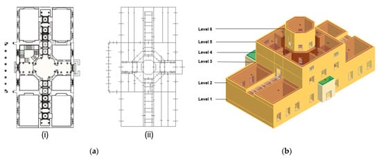 From Revit to 3Muri: (a) model in Autodesk Revit® (i) and simplified wireframe plan with all structural elements of all floors superimposed (ii); (b) identification of levels in 3Muri.
