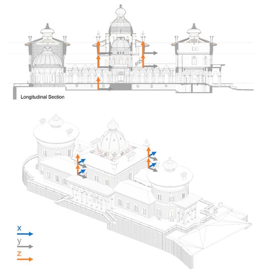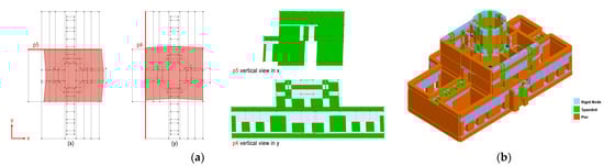 The final numerical calibrated model is depicted in Figure 11b. This model was ready for the seismic structural assessment of the central body of the palace to identify potential vulnerable structural elements and to support the design of retrofitting interventions.