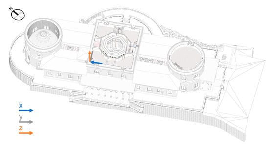 For the case of the present work, the central rectangular body was chosen as the focus, due to the symmetrical quality of the building. Specifically, the experimental campaign was started on the third floor of the central body, since this floor was not visitable by the public, allowing the campaign to be performed with reduced external impact (such as uncharacteristic vibrations of the structure due to the walking of visitors) and ease of access to areas for the placement of sensors near the outer walls that define the body. In the future, continuous monitoring should first be extended to the whole central body (Section 4) and then to the entire palace.
