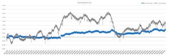Continuous monitoring data (for four months) of acceleration in g for XDK; measurements without detrending and filtering of 3 min average of the 1 s measures.