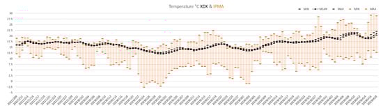 Continuous monitoring data (for four months) of temperature in °C XDK in black (mean, max and min by day) and IPMA day temperature in °C max and min values for Sintra.