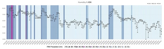 Continuous monitoring data (for four months) of humidity in % XDK in black (mean, max and min by day) and rainfall from Sintra IPMA.