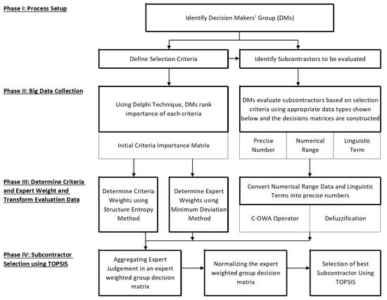 Previous studies listed above significantly improved the subcontractor selection process. Many existing models presented by past studies, however, are not capable of dealing with a growing number of selection criteria that are measured using different data types (e.g., precise numeric, numerical range, and linguistic variable). In addition, in most reviewed studies, the selection of construction subcontractors was treated as a multi-attribute, but single expert decision-making process, which did not recognize and incorporate the advantages of group decision-making. Each expert has his/her own experiences and specialty that can have significant subjective influence on the decisions they make in the subcontractor selection process. Thus, the appropriate implementation of the hybrid multi-attributes group decision-making model as proposed in this paper is advantageous in the way of being able to select and integrate different attributes and experts in the evaluation of construction projects’ subcontractors.