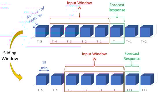 The first training sample for the input variable “” is built as a matrix with the dimensions , where is the window length (), and is the number of features. As shown in Figure 1, the window then slides forward by one step (15 min), the data from time step i + 1 create the second sample, and so on. The size of this sliding window controls how much historical data influences the prediction (e.g., 30 min, 60 min, 120 min, etc.).