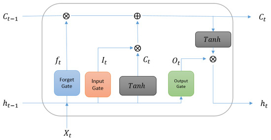 LSTM topology has been presented as a way to directly integrate time dependence. The fundamental concept is to dynamically integrate a sequential structure in order to enhance the functionality of conventional ANN approaches [51]. LSTM has demonstrated exceptional performance because it can learn the short- and long-term dependencies. The simultaneous inclusion of slow- and fast-moving phenomena makes LSTM a good option for indoor temperature prediction problems [52]. Time series data processing and prediction are all very well suited to LSTM networks [34,53]. The LSTM algorithm was considered in this research since it can capture features and remember them over time. A typical illustration of an LSTM cell is shown in Figure 3.