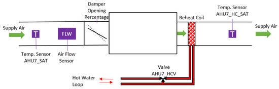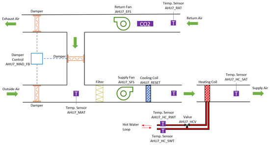 Figure 6 shows a schematic diagram of AHU7 with the available monitored parameters. Airflow is controlled via the supply and return fans. Recirculated air from the seven service zones is mixed with outdoor air and reconditioned through the AHU. The mixed-air conditions are controlled by three dampers regulating the percentages of air exhausted from the system, entering the system, and recirculating in the system. The mixed air is pulled through the filter via the supply fan and then cooled or heated when passing through the cooling and heating coils. The heating coil uses hot water supplied by the boiler. Heating is controlled by adjusting the flow of water through the coil, which is controlled by an electronic valve.