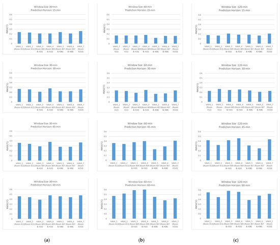 The five algorithms detailed in Section 4 were trained to predict indoor temperatures up to a 60 min forecast horizon with 15 min intervals and 30 min, 60 min, and 120 min sliding window sizes. Since the forecast horizon (T + 1, T + 2, etc.) and the time delay of input variables (sliding window width) have a major impact on the prediction model accuracy, various combinations of the two parameters are established in order to examine their interaction. The width of sliding windows of 2 (30 min), 4 (60 min), and 8 (120 min) time steps was investigated. As the system is notably changing fast, a lookback window beyond 120 min appears unnecessary and could potentially introduce noise to the prediction results without conferring any benefits. In addition, the RTs for the 15 to 60 min forecast horizon were predicted using the model since the equipment shows a rapid response to control commands.