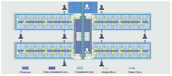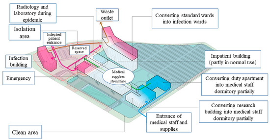 Under the second and third-level response state of the epidemic, the quarantine area will be expanded, and an emergency response site will be prepared outside of the infectious building. Additionally, the outpatient and emergency departments (in normal time) are switched into fever clinics, as shown in Figure 8. The medical supplies are moved to the polluted area through the medical technology building. Under this situation, the high-rise standard wards in the inpatient building are rearranged into an infectious disease area step by step, and staff members can use the entrance in logistics area.