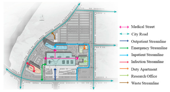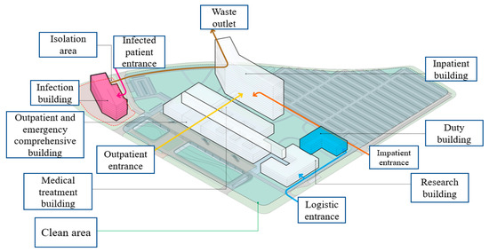 By contrast, the hospital is divided into two areas during normal functioning. One is the quarantine area (polluted area) including the infectious building, and the other is the general area (clean area) including the outpatient, inpatient, and administrative areas (Figure 7). In addition, the operation of the hospital has four main streamlines: the passage for infected patients, the passage for outpatients, the passage for logistics, and the passage for inpatients to prevent the contact of multiple groups of people. There is a separate outlet for the waste in the polluted area, which is isolated from clean area.