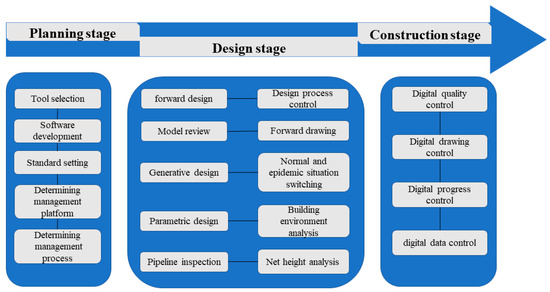 To address the challenges mentioned above, the designer played a strong leadership role in the information creation, management, and communication of BIM implementation. According to the characteristics of the project and the design requirements, the BIM workflow of the project was developed. Specifically, the main modeling scope, benchmark coordinates, and model naming of the different disciplines at each stage of the project were clarified, and the process of design coordination among all participants was also displayed clearly. The technical roadmap was split into three steps, namely implementation planning, design and application, and digital project management. Each step comprises several sub-processes to form a main task (Figure 5). Designers conducted collaborative design based on the virtual machine software VmWare platform [25] to integrate the software tools and data management process. Owing to the data basis for design analysis, the information model was used to conduct functional division, streamline organization and airflow analysis, and the different schemes can be further compared and optimized to enable a higher management efficiency. To ensure the reusability of the model, the components utilized in the modeling were all derived from the standardized model database that were independently developed, maintained, and were conducive to improve the BIM standardization in the construction and the design efficiency of the hospital.
