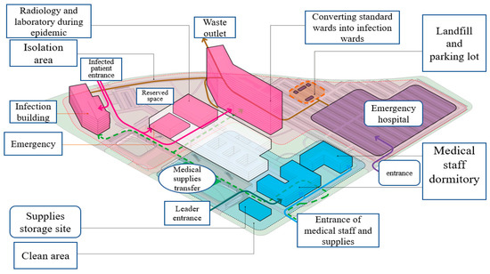 Under the state of first-level response to the epidemic, the overall layout of the hospital will change drastically and will be primarily used to deal with the public health emergency crisis, as shown in Figure 9. First, in terms of the overall layout of the site, a larger part of the hospital will be devoted to treat confirmed cases. At the same time, the reserved emergency response site will be quickly transformed into an emergency hospital to increase admission capacity. The parking lot will then be renovated into a site for incinerators, temporary waste storage, and vehicle disinfection to enhance the hospital’s emergency response capability.