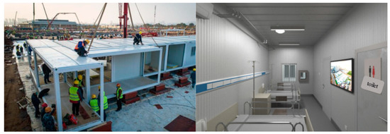 - Chen, L.; Yuan, R.; Ji, X.; Lu, X.; Xiao, J.; Tao, J.; Jiang, L. Modular composite building in urgent emergency engineering projects: A case study of accelerated design and construction of Wuhan Thunder God Mountain/Leishenshan hospital to COVID-19 pandemic. Autom. Constr. 2021, 124, 103555. [Google Scholar] [CrossRef] [PubMed]