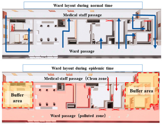 COVID-19 has hindered the global public health system [1]. The confirmed cases worldwide reached 559 million by July 2022. Since the outbreak in Wuhan, the acute shortage of admissions and treatment resources in designated hospitals have engendered huge pressure on local medical and health systems [2]. COVID-19 is highly contagious, and spreads fast through the air. Therefore, people are vulnerable to this new type of invader, resulting in an exponential growth of confirmed cases over a short period. The contagion of the virus has collapsed conventional medical facilities, which failed in functioning to stop the outbreak. With this in mind, more specialized hospitals are needed to accommodate the pandemic in terms of providing effective quarantine and preventing viral spread. However, the building of specialized hospitals for certain epidemics only, such as COVID-19, would overuse the public budget and medical resources, thereby compromising the service quality of the entire public health system. Therefore, rehabilitating conventional healthcare facilities in terms of architectural design would be a more optimized approach to deal with unexpected epidemics. Not only will it balance the medical facilities’ operation efficiency with serviceability, but it will also avoid the waste of medical resources (i.e., wards with extra medical instruments for infectious diseases).
