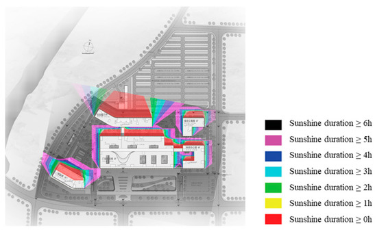 An analysis of the wind environment of the mixed-use hospital was conducted to verify the rationality of the design scheme. We concluded that the construction zone is well ventilated, and the area of vortex is in an acceptable range. The simulation results for summer and winter were shown in Figure 12. The sunshine simulation analysis was conducted with the Ladybug tool based on Rhino/Grasshopper [26], and the sunshine conditions were set based on the meteorological database. The cumulative duration of the sun exposure of each analysis point in the space was calculated by the software. As shown in (Figure 13), the sunshine duration and radiation amount in the construction zone are moderate, which complies with the sunshine specification and is acknowledged as being beneficial to patients’ rehabilitation.