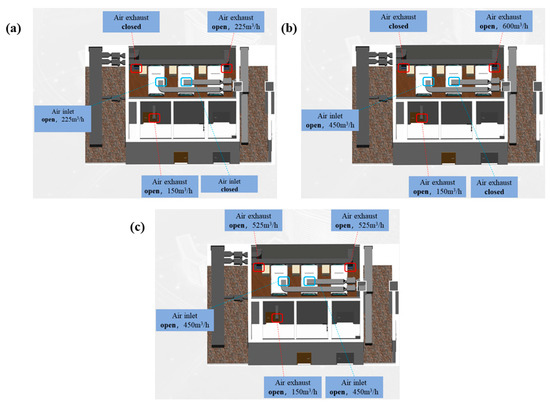 Air inlet and exhaust solutions for the isolation ward: (a) normal time, (b) isolation ward for infectious diseases during the epidemic period, and (c) ICU ward for infectious diseases during the epidemic period.