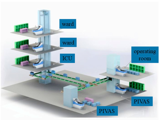 BIM has been employed to simulate the operation state of the box-type logistics system, so that the shaft setting, transportation route, and station setting can be reasonably arranged. The vertical shaft (1.6 m × 1.6 m) and the horizontal transfer pipe (0.7 m × 1.4 m) of the medium-sized box logistics lead time sorter are considered in this project. The simulation results based on BIM show that setting 46 box-type logistics sites and 11 reciprocating vertical elevators would be the best solution, as shown in Figure 15. The horizontal transmission facilities in the hospital are connected through the first and fifth floors. The material warehouse and pharmacy are connected to the first floor through an independent elevator to improve the transmission efficiency of key departments.