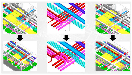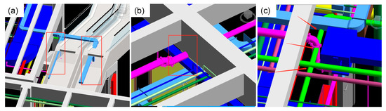 Engineering construction projects require the high-quality comprehensive ability of management personnel to take the overall control of the project. BIM technology can play an important role in this process. Thus, the engineering procurement construction management platform was developed based on webGL, which enables stakeholders to share information through a mobile App and update project progress in real time, including quality management, safety management, schedule management, and drawing updates. It can ultimately improve the overall management efficiency through digital technology. For example, after the completion of the pipeline design, the self-developed automatic pipeline bending algorithm was used to carry out the overall automatic pipeline synthesis. Through pipeline adjustment, the results of pipeline synthesis could be quickly obtained. Therefore, the best scheme could be selected after thoughtful comparison, which could reduce the rework and save construction time and cost, as shown in Figure 16. In addition, we evaluate clash detection as well using BIM. Examples have been presented in Figure 17.