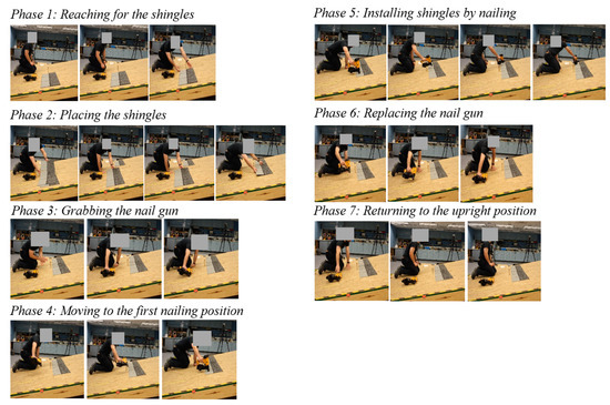 A typical shingle installation operation can be divided into seven phases: (1) reaching for shingles, (2) placing shingles, (3) grasping the nail gun, (4) moving to the first nailing position, (5) nailing shingles, (6) replacing the nail gun, and (7) returning to the upright position [9], as illustrated in Figure 1. Different phases are associated with different levels of risks depending on the criteria of (a) the duration of the awkward knee joint rotation that roofers encounter in a phase, (b) the forceful exertion generated within the phase, which relates to the maximum knee joint rotation, and (c) the number of repetitions of the awkward knee joint rotations within a phase. Recently, the authors investigated the shingle installation work conditions at an operational level and examined the risks of the seven phases involved in the process of shingle installation task to knee MSD development among roofers [9]. It was revealed that over the course of roofing shingle installation, based on the awkward knee rotations and repetitive motions considering flexion, abduction, adduction, and internal and external knee rotations of roofers, different phases during shingle installation expose roofers to different levels of knee MSD risks. In particular, Phases 2 and 5 (i.e., placing and nailing shingles) were found to cause the highest awkward rotation, repetition, and forceful exertion and are deemed to be the riskiest phases for developing knee MSDs among roofers [9].