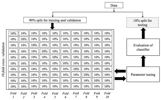 From the experiment, 148,574 time series data points were utilized for training and evaluating the classifiers. Figure 3 outlines the overall procedure followed in the training and evaluation process for each classifier. In this process, 90% of the feature data were used for training and validation, while the remaining 10% (hold-out) were set aside for testing purposes. To minimize the bias, variance, and overfitting during the construction of the classification models, a 10-fold cross-validation technique was employed. This involved randomly assigning all observations in the training and validation set to ten separate folds, with each fold representing 10% of the data. Then, the classifier was trained using nine folds of the data and validated using the remaining fold. This procedure was repeated ten times, with each time using a different fold as the validation set. The final accuracy (i.e., the mean cross-validation accuracy) was calculated by averaging the accuracies achieved from the ten resulting folds.