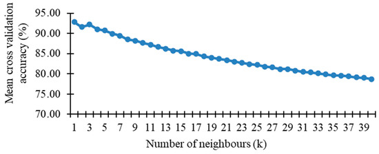 The KNN classifier predicts a class based on the features of known observations that are close to it. In KNN classification, k-nearest training data points from a testing data point are identified by measuring the Euclidean distance between the test data point and each of the training data points [50]. The choice of k can significantly affect the performance of the KNN algorithm. In this study, different values of k, ranging from 1 to 40, were attempted to see the impact on the cross-validation accuracy of the classifier (Figure 4). With the increase in the value of k, a decreasing trend in the cross-validation accuracy was observed. Based on this, k = 1 was identified to provide the highest mean cross-validation accuracy and was therefore chosen for constructing the KNN classifier.