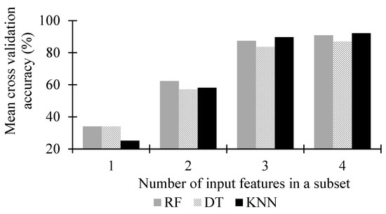 The mean cross-validation accuracies obtained from the three approaches for a number of input features in a subset are depicted in Figure 5. Please note that for each number of input features in a subset, presented in Table 2, only the result of the input feature subset that provided the highest mean cross-validation accuracy has been presented. For all three classifier types, the highest mean cross-validation accuracies were obtained when all four features were used; therefore, the classifiers trained on all four features were selected for further analysis.