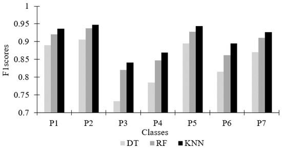 Since the performance of a classification algorithm is highly dependent on the used dataset and the features, three classifiers that are generally thought to function best for multiclass classification problems were selected and tested in this study: the random forest (RF), the decision tree (DT), and k-nearest neighbors (KNNs). The KNN classifier performs well when the number of features is low [41]. The RF classifier is well applicable to handle both numerical and categorical features and imbalanced datasets with a non-uniform distribution of class labels [42,43]. The DT classifier is used for handling non-linear datasets effectively [44].