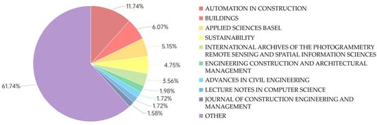 The publication sources related to ImTs in the field of BIM within the context of metaverse are shown in Figure 3. A total of 758 articles have been published in 377 publications, of which 38.26% of the articles are from nine primary sources which are Automation in Construction, with 11.74% of all the published articles, followed by Buildings (6.07%), Applied Sciences Basel (5.15%), Sustainability (4.75%), International Archives of the Photogrammetry Remote Sensing and Spatial Information Sciences (3.56%), Engineering Construction and Architectural Management (1.98%), Advances in Civil Engineering (1.72%), Lecture Notes in Computer Science (1.72%), and Journal of Construction Engineering and Management (1.58%).