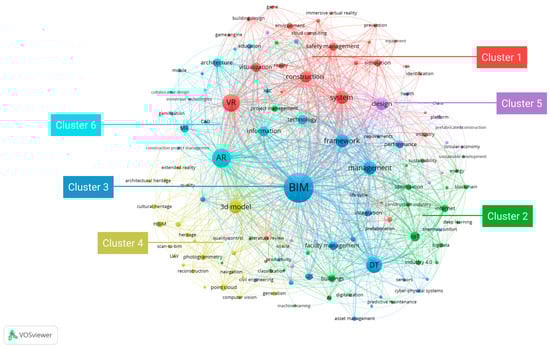 As shown in Table 2, the cluster terms that are more closely related to the topic of ImTs in BIM are BIM, AR, VR, DT, and system. Moreover, the high-frequency keywords are derived by keywords co-occurrence analysis in the VOSviewer, which specifies a minimum number of keyword appearances of 30 times, including their colour representation, cluster, occurrence frequency, and total link strength. Furthermore, the keywords listed in Table 2 are grouped in line with the six clusters as follows: