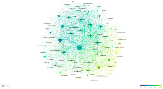 In the network visualisation generated by VOSviewer, the size of the node circle represents the frequency of occurrence of a keyword. The larger the node, the higher the frequency of the same keyword appearing in different articles. The keyword “BIM” occupies the most significant node in the centre of Figure 4. The distance between two keywords represents the strength of direct affinity between two topics, while the width of the line represents the strength of the connection between them [42]. Based on the network-visualisation map of the keywords co-occurrence analysis (Figure 4), the knowledge structure and research hotspots of ImTs in BIM can be revealed.