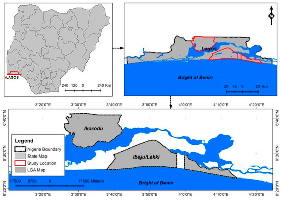 Numerous areas in Lagos State are affected by floods on an annual basis. In 2010, floods were recorded in Ajegunle, Agiliti, Ikorodu, Ikoyi, Ipaja-Ayobo, Mile 12, and Victoria Island [87]. Following the annual flood forecast announcement of the hydrological services agency on 28 May 2020, the Lagos State government advised residents to be alert to flooding. Two LGAs (Ibeju Lekki and Ikorodu) were selected for investigation. They were chosen because of their historical disposition to flooding, their present flood-risk status based on the hydrological service agency alert, and the high impact on the most recent flooded properties [88,89].