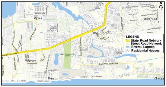 The respondents’ demographics cut across the upper class, the middle class, and the lower class. The housing properties traded by the investors and agents who participated in the questionnaire were privately owned properties. The distribution of the residential properties in this area includes bungalows, multi-storey buildings, detached houses, and fenced buildings. There are some corner shops, parks, and a few industrial buildings in the area as well. Using satellite images retrieved from publicly available map data, the street maps with the distribution of various buildings in the study area was visualised. Different studies were identified that utilised such mapping techniques in the description of the study areas [77,78]. The typical distribution of the residential location shows bungalows, multi-storey buildings, semi-detached buildings, and detached buildings. Figure 3 shows the distribution of residential properties in Ibeju Lekki, Lagos. Figure 4 shows the satellite map showing the places in this study area for Ikorodu and Lekki, Lagos.