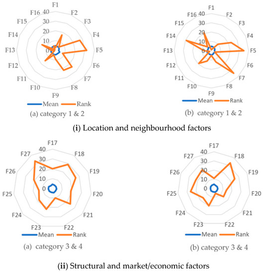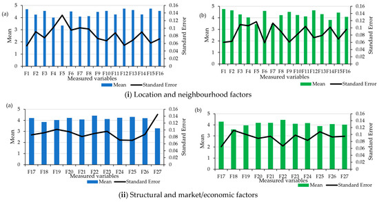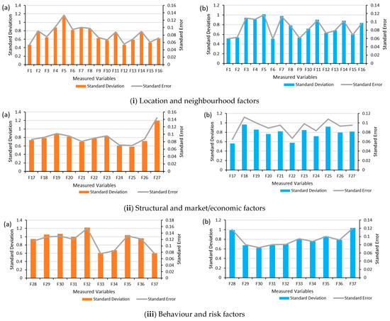 An initial content analysis of previous research and the authors’ knowledge of the residential investment sector were used to identify factors potentially influencing decision-making for residential property investment (see Refs. [56,58,77,78] and a pilot study [90]). These resulted in 37 factors that were grouped into 6 categorical factors—namely, location, neighbourhood, structural, market/economic, behavioural, and risk, with each category having its own sub-factors. The individual categories had subunits of factors that were subsequently investigated. The categorical factors and their associated subunit factors are presented in Table 2, Table 3 and Table 4. The investigated subunits of factors were assigned codes F1–F37. This was to facilitate easy identification, referencing, and manageability. It was also used for both ranking and decision-making based on significance levels. To ease the identification of each factor selected, the six categorical factors were delineated into these 3 tables.
