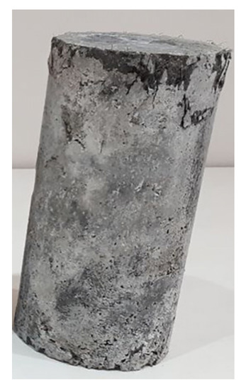 Displacement-controlled loading with a rate of 1 mm/min was applied to 100 × 100 × 200 mm cylindrical UHPFRs according to ASTM C39/C39M [55]. A minimum of 175 MPa value was achieved based on the average of three test specimens, which satisfies the regulations of UHPC [56]. The cracking pattern of the cylindrical specimen is shown in Figure 3. Due to the presence of MS fibres, the integrity of the specimen has been completely maintained, with cracks parallel to the specimen only in regions close to the loading surface.