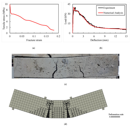 With the knowledge that testing UHPFRC specimens under direct tension is challenging, inverse analysis is a good alternative to derive the direct tensile curve from flexural loading test. This method has been previously used by the authors [65,66,67,68,69]. The main concept relies on finding the mid-span deflection values, where differences between the numerical curve and the experimental curve are noticeable and updating the initially defined tensile stress-tensile strain curve based on the user’s experience at the strain values corresponding to the above-mentioned deflections. Correlation between fracture strain and deflections is possible by monitoring crack mid-span crack widths using Equation (1):