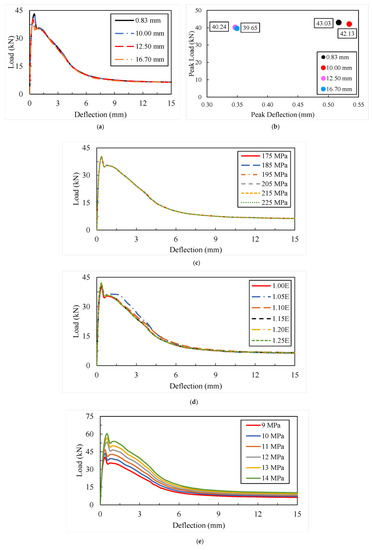 (a) Peak load vs. deflection, and sensitivity analyses with regard to (b) mesh size, (c) compressive strength, (d) modulus of elasticity, and (e) tensile strength of UHPFRC beams under 4PBT.