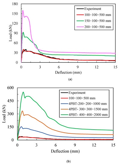 Four different mesh sizes, namely 16.7 mm, 12.5 mm, 10 mm, and 8.3 mm, were chosen to investigate the effect of mesh size on the flexural response of the beam and verify mesh convergence. The result is shown in Figure 6a,b. It is observed that a finer mesh leads to a stiffer flexural response. By increasing the mesh size from 16.7 mm–8.3 mm, the response became 1.49%, 6.25%, and 8.52% stiffer. This issue can be justified by the fact that according to the documentation of ATENA [58], finer mesh means smaller characteristic length values, which in turn result in smaller crack widths according to Equation (1). Therefore, the response becomes stiffer.