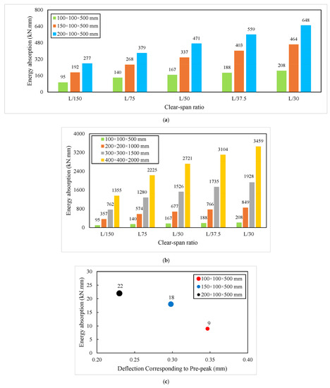 - Linear relationships (with over 0.96) exist between the energy absorption parameter and variations of tensile strength, depth, and overall size of the beam.