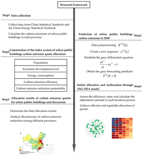 Due to significant disparities in development among different regions in China, the allocation of carbon emission quotas for urban public buildings should be coordinated and harmonized. The allocation process is illustrated in Figure 1. First, the research data were collected from China Statistical Yearbook and the China Energy Statistical Yearbook. Next, the carbon emissions from urban public buildings in China for the year 2030 were predicted using the GM (1,1) model. Subsequently, adhering to the principles of fairness and efficiency, and considering factors such as population, economic development, and energy consumption in each province, the iteration and reallocation results were carried out using the ZSG-DEA model. Lastly, analysis and discussion were conducted on the allocation results of carbon emission quotas for urban public buildings and the pressure to reduce emissions.