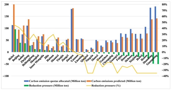 This paper utilizes historical data on carbon emissions to forecast the expected CO2 emissions for every province in China by 2030. Subsequently, we utilized the principles of equality and efficiency to distribute carbon quotas to each province, which provide a strong foundation for measuring the pressure of carbon emission reduction for provinces. Reduction pressure is a metric that quantifies each province’s carbon emission reduction goal towards the country’s target. If the projected carbon emissions for a province were to surpass its allocated quota, then it incurred a positive reduction pressure, indicating the need to reduce emissions further. Conversely, if the projected carbon emissions were lower than the allocated quota, then it had a quota surplus, resulting in negative reduction pressure. The carbon emission reduction pressure was estimated by the gap between the allocated quota and the projected carbon emissions of provinces, measured in millions of tons. The higher the reduction pressure value, the greater the mitigation efforts required by the province to meet the 2030 carbon emission reduction targets. Moreover, we utilized the percentage of carbon emission reduction pressure to provide a relative indication of the effort required for each province, calculated as the ratio of the carbon emission reduction pressure to the allocated carbon emission quota. Figure 6 provides a visual representation of the pressure on each province in China to reduce its carbon emissions.