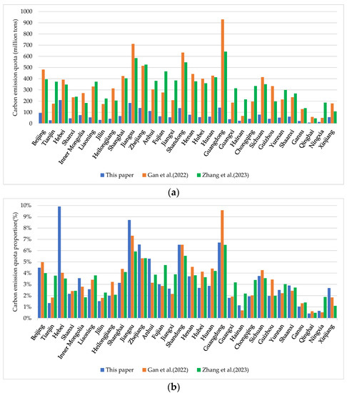 The comparison of allocation results for urban public buildings in 2030 between this paper and the published literature. (a) Carbon emission quota allocation results among provinces; (b) proportion of carbon emission quota allocation results among provinces (Gan et al. (2022) [9] and Zhang et al. (2023) [24]).