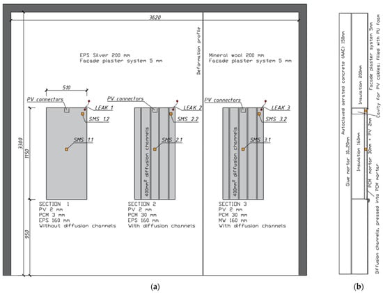 A 3.6 m wide and 3.3 m high test wall was built in the climate chamber (Figure 2a) with three different sections: (1) Reference section with PCM mortar without diffusion channels; (2) PCM mortar on expanded polystyrene (EPS) with diffusion channels behind PV; and (3) PCM mortar on mineral wool (MW) insulation with diffusion channels behind PV (Figure 1). EPS and mineral wool areas were separated with PU foam and the facade plaster was separated with a deformation profile on top of the PU foam.