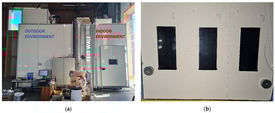 Climate chamber used for building the test wall (a) and the test wall inside the climate chamber (b).