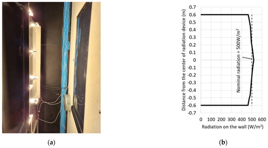 Solar radiation emulator, made of 8 Tungsten halogen lamps and an aluminum sheet (a). Three of these radiation stands were used, one for each wall section tested. Radiation intensity graph (b) for the radiation device at distance of 60 cm (right). Zipp Zonen CMP11 Pyranometer was used to calibrate the radiation devices.