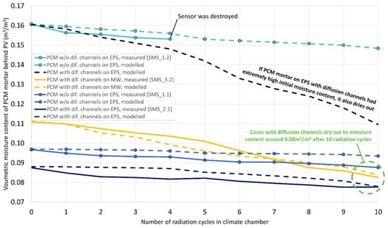 It can be seen from Figure 11 that the drying out of moisture in PCM mortar without the diffusion channels was significantly slower. This is also backed up by the calculation model results. The worst-case scenario (without diffusion channels, and high initial moisture content from the water leakage) showed very small changes of dampness, and the high moisture level even short-circuited the soil moisture sensor used. Overall, the modelled results show that 10 cycles do not reduce the moisture level below 0.148 m3/m3.